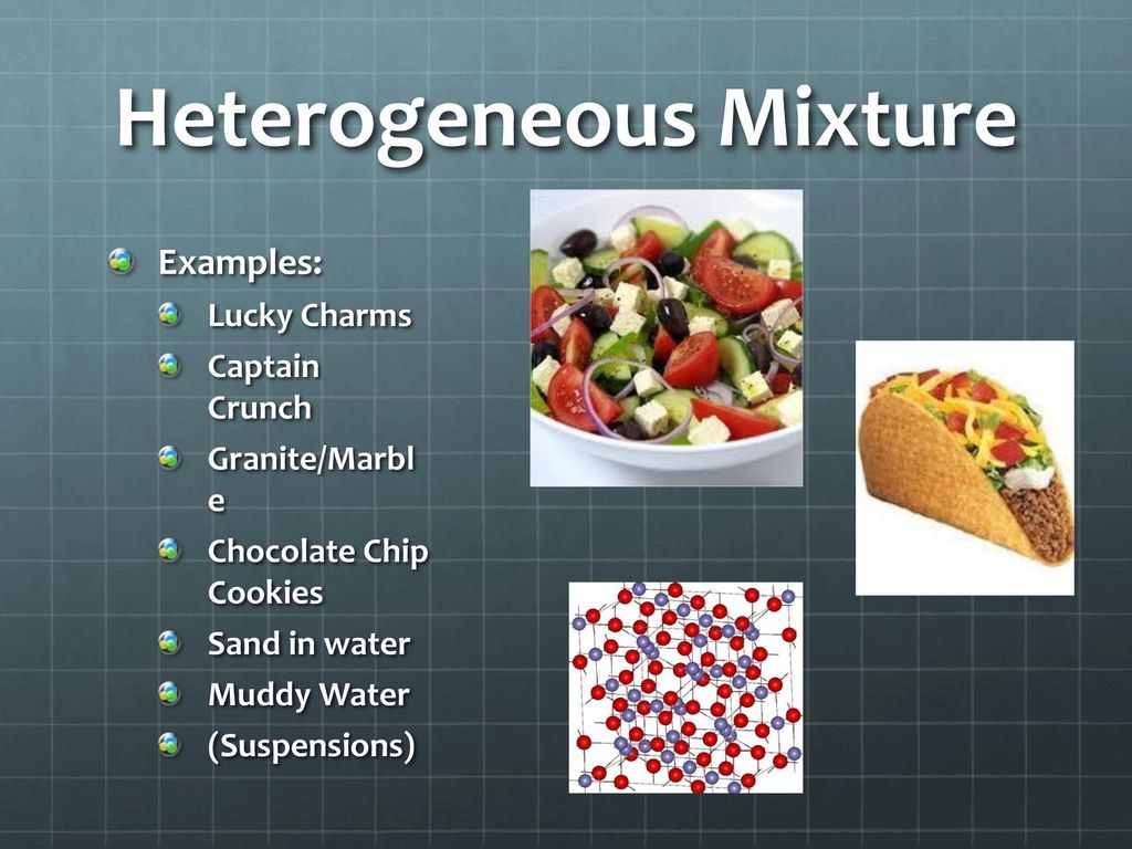 A heterogeneous mixture has a non-uniform composition and the different components remain physically distinct. The substances often exist in multiple phases and the boundaries between components are usually visible.