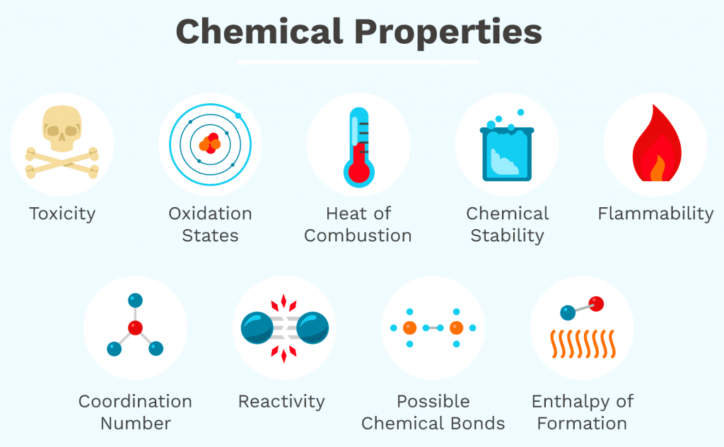Chemical properties are observed only during a chemical reaction, and they involve a change in the substance’s chemical identity. They describe the potential of a substance to undergo specific chemical changes.