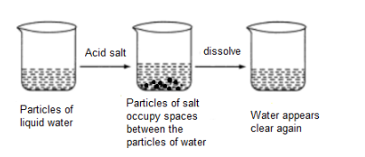 When salt is added to water, it dissolves without significantly increasing the water level. This is because salt particles occupy the spaces between water molecules.