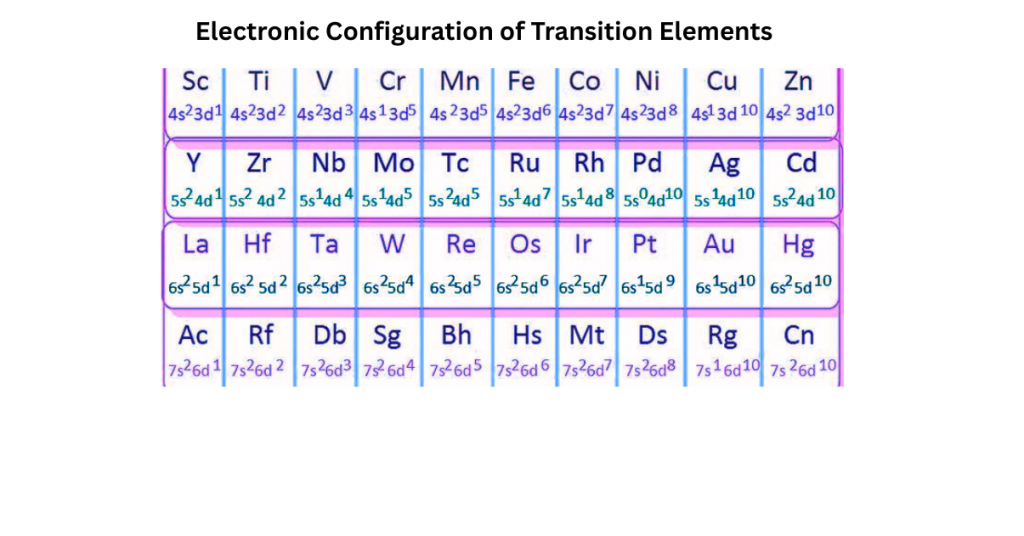 Transition elements have unique electron arrangements that involve filling the (n−1)d subshell and the ns subshell. This electron configuration influences many of their chemical and physical properties, such as variable oxidation states, colored compounds, and catalytic activity.